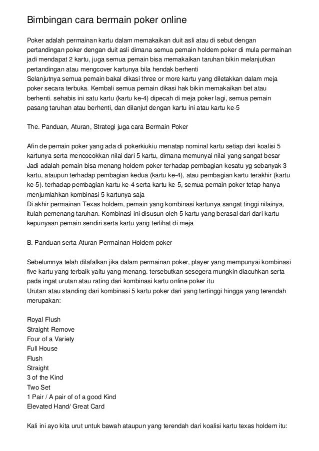Panduan aturan bermain poker online ini, bisa membantu anda disaat sedang melaksanakannya. Jika anda masih bingung dalam pilihan sebuah situs. Aturan saat bermain; Jika sudah berhasil mengakses situs betting poker, maka nantinya jadi lebih bisa mudah untuk dimainkan. Seperti aturan dalam mendapatkan kartu yang akan disusun itu juga menjadi hal yang penting diperhatikan. Untuk aturan permain poker masih sama dengan aturan pada umumnya, baik kamu bermain dengan uang asli ataupun bermain secara online. Hanya saja aturan sekarang sudah lebih luas apalagi jika kamu bermain online. Bermain online saja 1 meja permainan sudah bisa di duduki 6-8 pemain poker yang dimana dulu hanya 4 orang saja. Pembagian kartu poker.